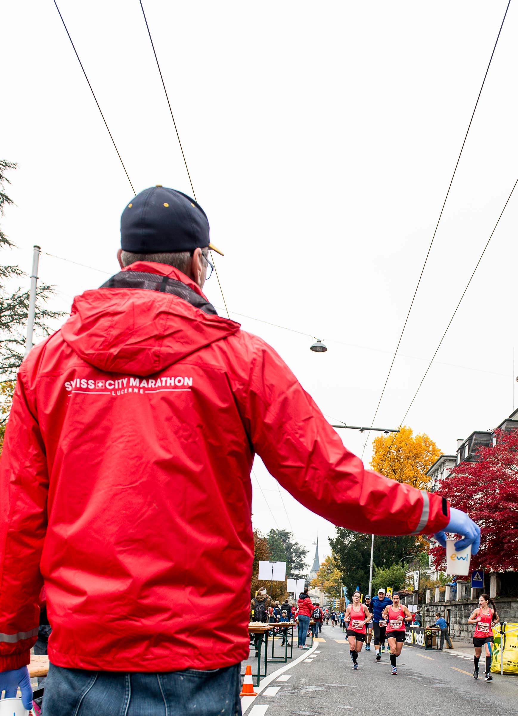 Für den Spitzenläufer ist die Sicht auf die aktuelle Zwischenzeit immer frei. Ob er die goldigen 10 Jahres Jubi Zahlen über der Reussbrücke gesehen hat oder nur seine Zeit?