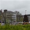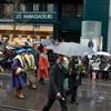 Die Menschen Menge unter dern farbigen Schirmen lacht laut und verlässt Platz, ohne das obligate Bratwurstgrillen.