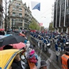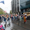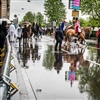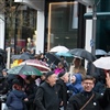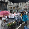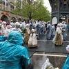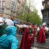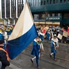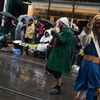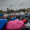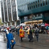 Die Menschen Menge unter dern farbigen Schirmen lacht laut und verlässt Platz, ohne das obligate Bratwurstgrillen.
