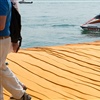 Der Zugang zur Insel ist an diesen Tagen viel erlebnisreicher zu Fuss, schreitend über die rund 220'000 Plastikboxen, die unter dem Tuch miteinander verbunden sind. Mittels tonnenschwerer Anker im See, sind sie fixiert und bleiben auch bei Wind und Gewitter, über dem See schaukelnd an ihrem zugewiesenen Platz.